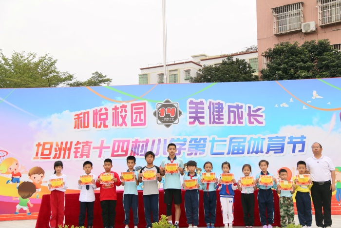 为有效促进学生的健身运动,增进班级的团结,给众多学生一次展示体育特长的机会。坦洲镇十四村小学于11月13日举行主题为:“和悦校园,美健成长”第七届体育节暨第22届田径运动会。全校师生和家长志愿者近七百人参加此次校运会。