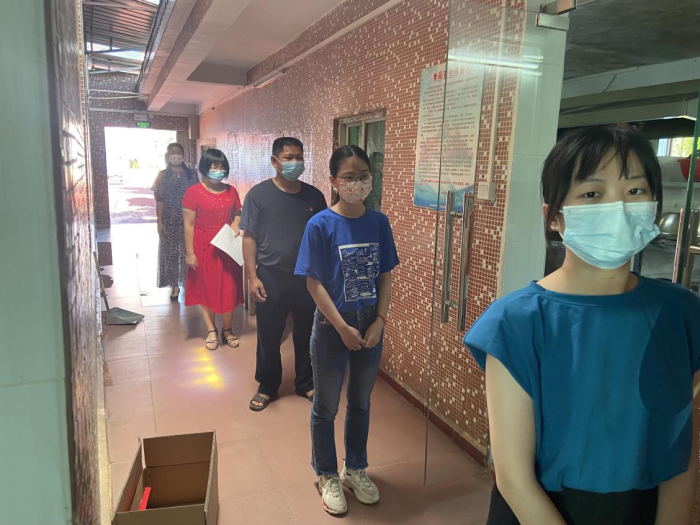 首先,模拟进校晨检工作。学生分批错峰到校,返校学生间隔1米以上有序排队等待值日老师测温,体温正常方可入校。学生出现发热症状应急处置,临时观测区处置,发现发热症状,由校医进行复查以及健康咨询,老师层级汇报演练等。