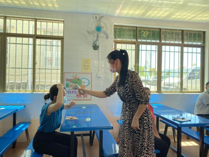 接着,模拟上课过程出现发热学生。科任老师引导学生戴上口罩并测温,若额温超过37.3℃,及时带领发热学生带到隔离室复查,同时班干部带领其他同学到备用课室就座。待校医复查后如体温异常,班主任立即通知家长带离,到医院就诊。如果学生有流行性病学史,学校按照新冠肺炎疫情应急方案逐级上报。