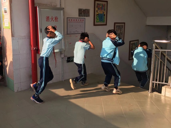 随着校园内响起的警报声,上课老师指挥本班学生按原指定路线有序地撤离教室,全体学生抱头弯腰有序撤出教学楼疏散到教学楼前指定位置,整个过程老师灵活处理突发问题,整个应急演练活动规范、有序、紧凑、高效,按照疏散演练方案设定的逃生路线,迅速而有序地到达指定安全位置。