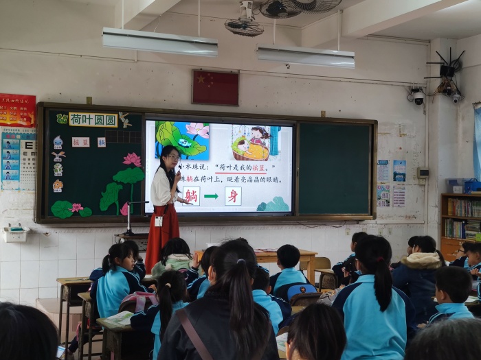 活动第一环节由金斗湾小学余美卿老师执教课例《荷叶圆圆》。课堂上,余老师深入文本,注重朗读指导,引导学生联系生活,展开想象进行个性化表达,让学生学有所思,学有所成。课后,参加活动领导、老师结合本次的课例,对如何构建语文高效课堂展开研讨。杨兴副局长抛砖引玉,结合自身的学习经历,充分肯定了这节课的精彩之处,在于注重创设情境、朗读的指导以及师生的感情互动,课堂氛围轻松活泼,充满童真童趣。其后,老师们各抒己见,纷纷对如何构建语文高效课堂提出自己的见解,绽放出了群体智慧的光芒。陈丽娥副主任要求教师们要做好课堂常规,积极钻研反思,不断提高自身专业水平,提高课堂效率。教研专干梁北桥老师指出,要构建语文高效课堂,须用好教材,关注课文原文、阅读提示和课后练习,明确每课教学目标,落实课堂写字的指导和训练。李伟老师则从心理学角度出发,提出高效课堂要关注学生的最近发展区,注重对学生的能力培养和情感培养。