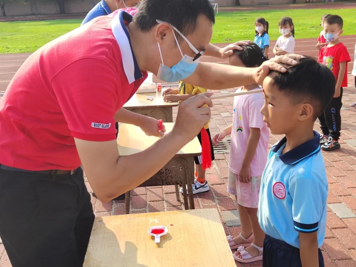 在点朱砂环节,由校长范田华、德育主任张超金、教导主任文学平组成的领导小组为一年级学生点朱砂,寓意:开启智慧,希望孩子们眼明心亮。范校长、张主任、文主任以和蔼的笑容,给新生们送上祝福的话语。