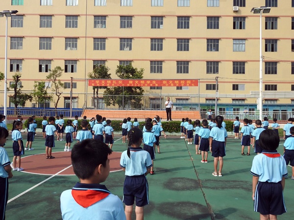 8:30分,同学们排着整齐的队伍来到操场,参加学校开学典礼。结合今年创文活动,今学期开学典礼的主题是“学文明礼仪,做文明学生,创文明校园”。开学典礼首先由学校小主持人带领全校同学齐念社会主义核心价值观,并向全校师生宣读创文倡议书。接着,六(1)班的学生代表文欣蕊做新学期国旗下讲话。她先介绍自己如何过一个有意义的暑假,然后代表全校同学向学校承诺要做一名爱我,爱家,爱校,爱国的四爱好学子。