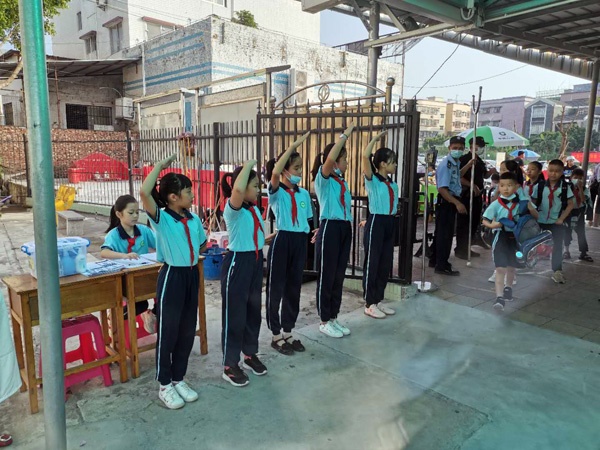 早上,阳光跟师生们的心情一样热情,激动!学校老师和少先队爱校服务队的同学一早就在学校门口迎接同学们的到来。同学们穿着整齐的校服,佩戴着鲜艳的红领巾,精神抖擞的来到学校,有序地测温后,回到了教室,开启了新学年的第一天。