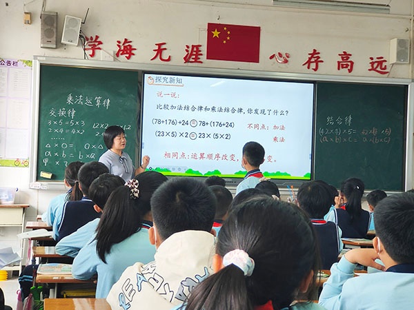 首先,由坦洲镇永一小学的晏黎老师呈现四年级课例《乘法交换律和结合律》。在课堂上,晏老师大胆的引导学生,根据已经学过的加法交换律和结合律,对乘法交换律和结合律进行猜想和验证,把课堂交给学生。在探索的过程中,晏老师层层递进,对比分析,抓住课堂生成资源,充分利用学生探索过程中出错的地方予以解析,逐步带领学生由错转对,由一知半解到透彻领悟。