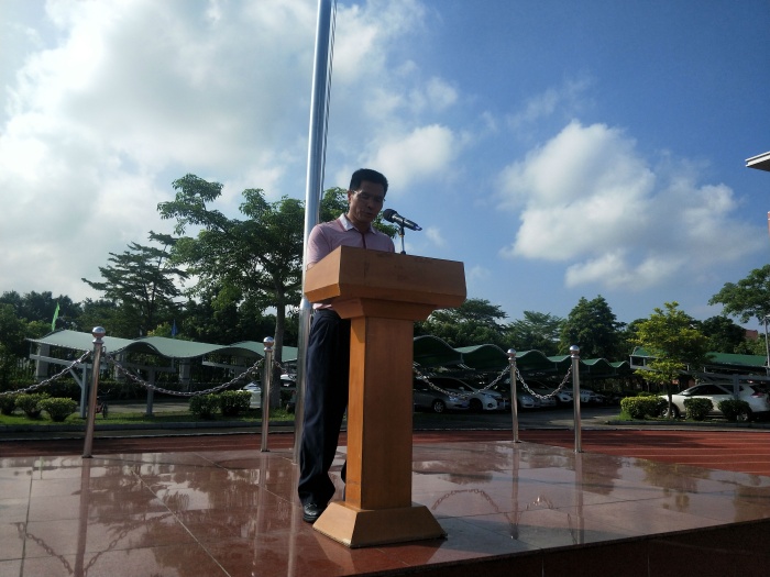 为贯彻落实《广东省教育厅关于做好2020年秋季学期高校党委书记、校长和院(系)党组织书记、院长(系主任)及中小学党组织书记、校长上第一堂思政课工作的通知》精神,暨中华人民共和国成立71周年之际,2020年9月30日上午,中山市坦洲中学校党总支书记、校长吴剑文在学校操场为全校2500多名师生讲授了新学期第一堂思想政治理论课。