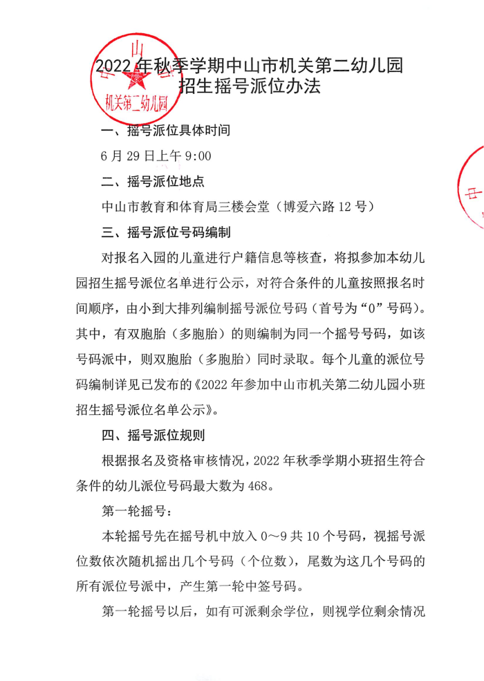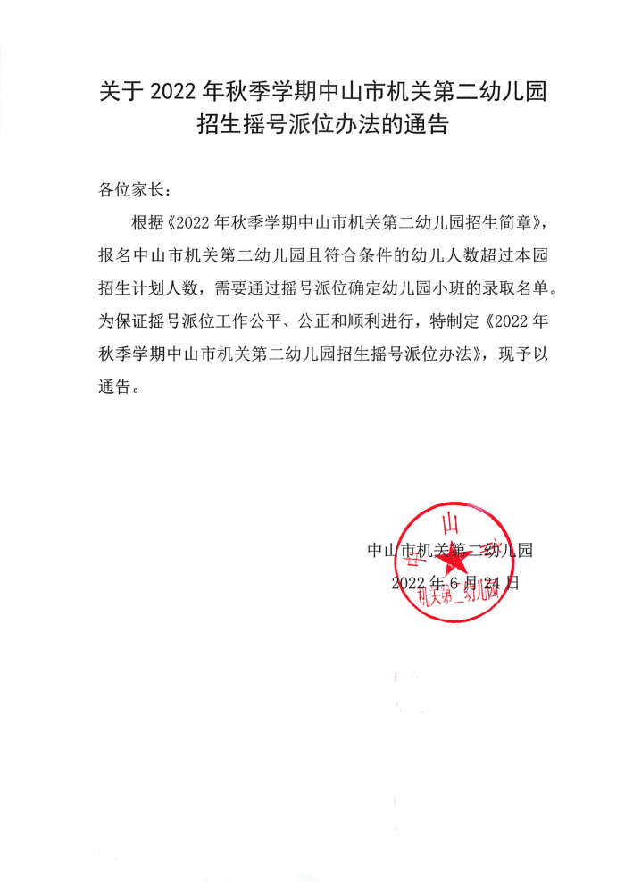 关于2022年秋季学期中山市机关第二幼儿园招生摇号派位办法的通告