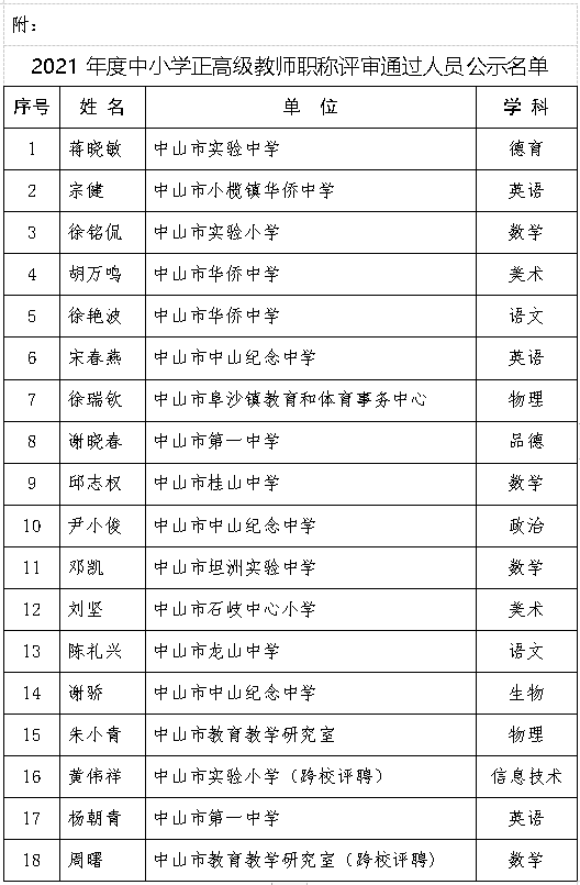 附:2021年度中山市中小学正高级教师职称评审通过人员名单