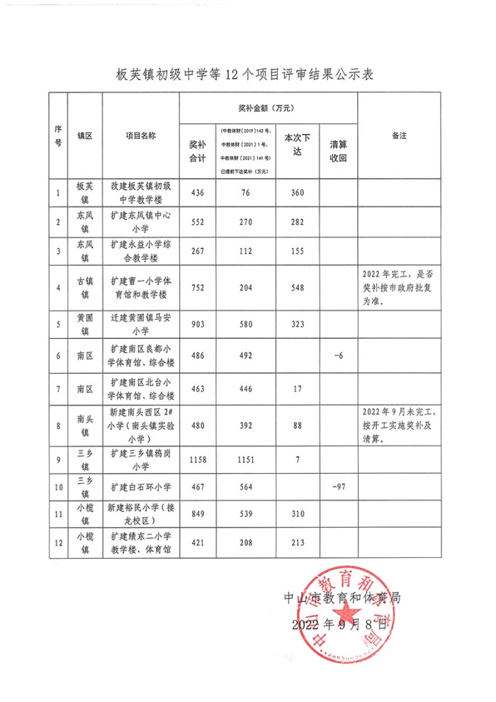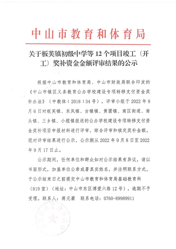 中山市教育和体育局关于板芙镇初级中学等12个项目竣工(开工)奖补资金金额评审结果的公示