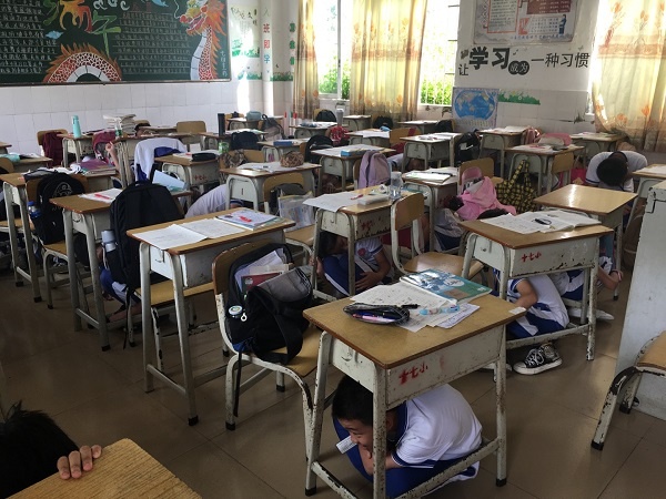 为了此次活动能顺利进行,在演练开始前,学校进行了精心的部署,制定了详细的演练方案,明确了通讯联络员、疏散指挥员、医护人员等相关成员的责任。上午八点十分,第一次警报声响起,各班学生在上课教师的指挥下,迅速抱头或头顶书包就近蹲在课桌下躲避。警报声再次响起后,同学们在上课老师的带领下,头顶书本紧张而有序地撤离教室,跑到空旷的运动场。全体学生到达安全地带后,各班班主任和负责疏散指挥的老师迅速就位,维持好各班秩序,清点人数,并向总指挥汇报班级情况。整个演练活动用时9分50秒,达到了此次防震减灾应急安全疏散演练活动的预期效果。