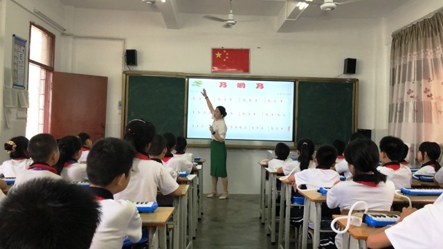 一名党员就是一面旗帜。毕业于华南师大的高材生林建红老师,也是一名共产党员。为充分发挥党员的先锋模范作用,林老师主动请缨参与帮扶。为完成送教任务,她周末认真备课至凌晨,虽路途遥远、身体不适,可她坚持克服困难,满腔热情地给孩子们上了一节《乃哟乃》口风琴教学课。在此之前,因为疫情,五桂山学校音乐老师通过线上课堂对大沟小学的同学进行了口风琴吹奏的基础知识教学。此次到了大沟小学,林老师和同学们都十分珍惜这次面对面教和学的机会。