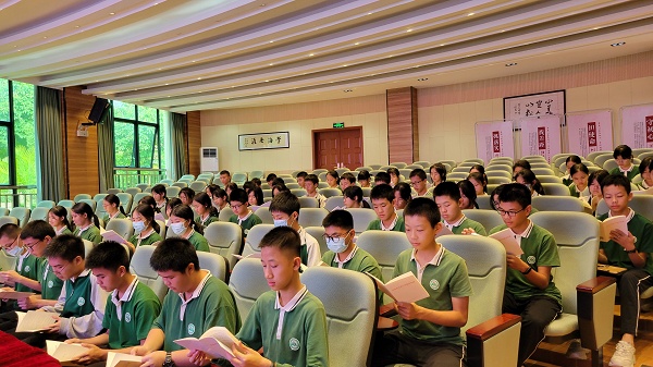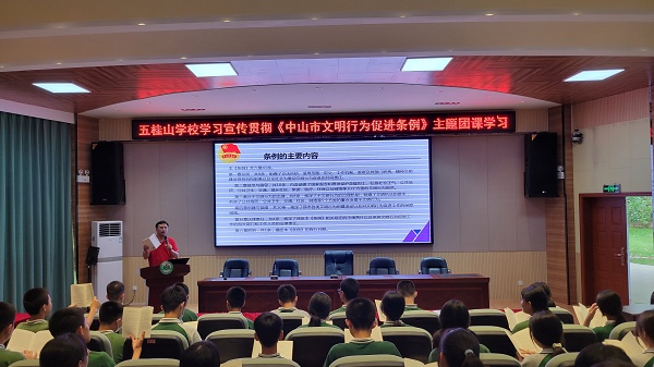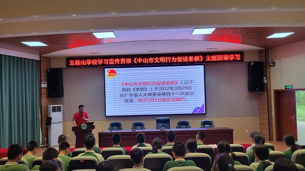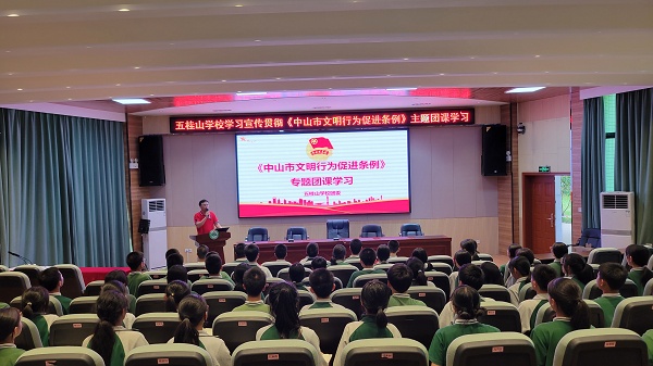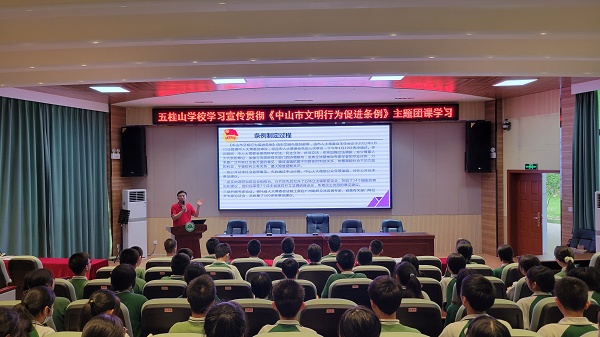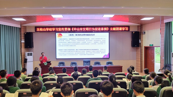为学习宣传和落实《中山市文明行为促进条例》实施方案,提升广大青年学生的文明意识和文明素养,规范促进其文明行为,践行社会主义核心价值观,助力文明城市建设,2022年5月26日。五桂山学校团委在学校综合报告厅开展了以“文明学习我带头 践行新时代文明”为主题的《中山市文明行为促进条例》主题团课学习。团课学习由五桂山学校团委书记冯锐强主讲,全体团员、团校学员、少先队干部共70多人参加了本次学习。