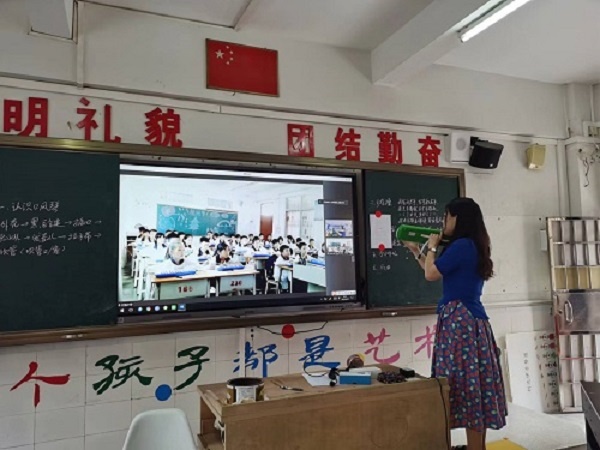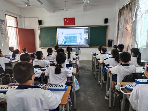 一根网线,一块屏幕,将相距四百多公里的两校师生紧紧连在一起。姚敏凤老师的口风琴课教同学们认识口风琴、学做手指操、学习手型、认识键盘、学习呼吸并且学习吹奏歌曲《摇啊摇》。潘玉迪老师的《吃瓜果的人》美术课,深深吸引了大沟小学二年级的同学们,用欣赏小朋友吃瓜果的表情视频进行课堂导入,通过讲解知识点、微课讲解绘画步骤及教师示范教同学们画吃瓜果的人。两节艺术课带给大沟小学的同学们以别开生面的体验,孩子们兴趣盎然、乐在其中。