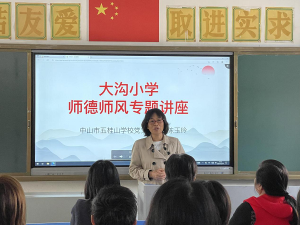 14日上午,送教教师与大沟小学行政齐聚会议室,陈玉玲校长结合学校的基本情况、办学理念、办学特色等与大沟小学行政领导进行办学理念研讨,并作以“师者,以德为先”为主题的师德师风专题讲座。