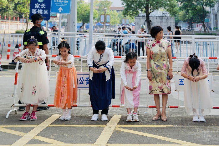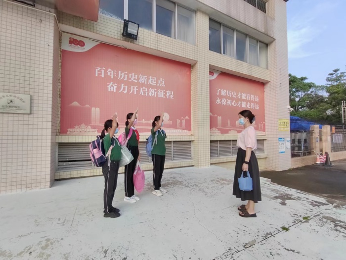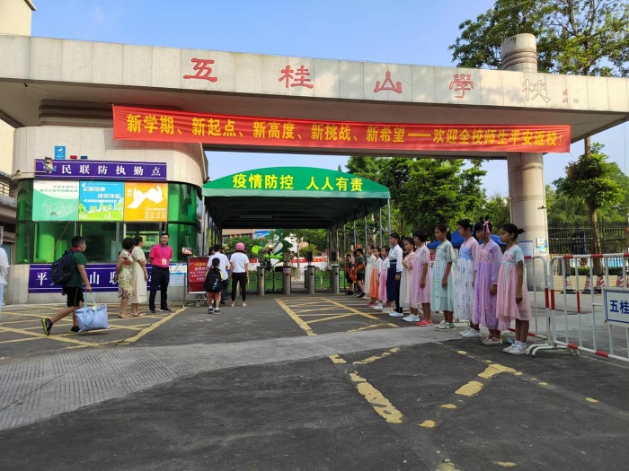2022年9月1日,是新学年开学的第一天。五桂山学校的校门,一列穿上了具有民族特色衣裳——汉服的“小天使”,成为学校开学第一天的亮丽风景线!她们对每一位到校的同学行中华民族传统“作揖礼”。“老师好!”“欢迎同学们平安返校!”“戴好口罩,1米距离”,在一声声友善的问好的提醒中,原本安静的学校顿时热闹非凡。