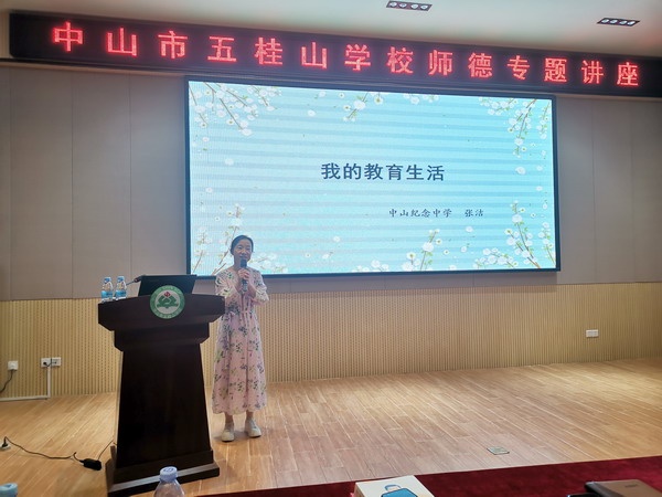 随后,中山市师德标兵——中山市纪念中学的张洁老师以“我的教育生活”为主题,围绕“爱岗敬业”这四个字阐述了自己对师德的理解。张老师说,热爱自己的岗位,尊重自己的事业,从信念、时间、知识和感受力上学会爱岗,从思想里认定自己的职业的高贵和尊严。她的一句“爱是最高的师德,用伟大的爱去做平凡而微小的是就是最好的师风”引起了大家对师德师风建设的深思。