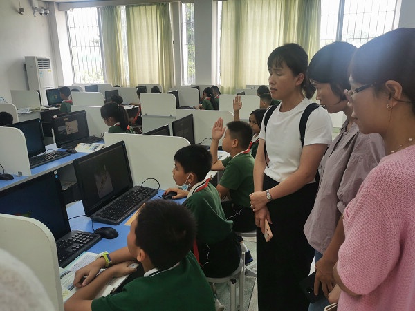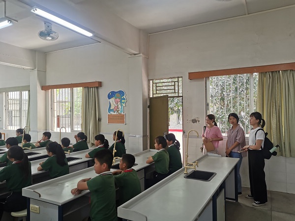 随后,教导处主任黄建良带领老师们参观了教学功能场室,果实累累的红色劳动实践基地、仪器精良的科学室、设备先进的电脑室、装饰丰富的美术室、音符纷飞的音乐室和绿草如茵的体育场。