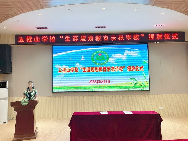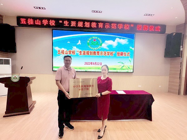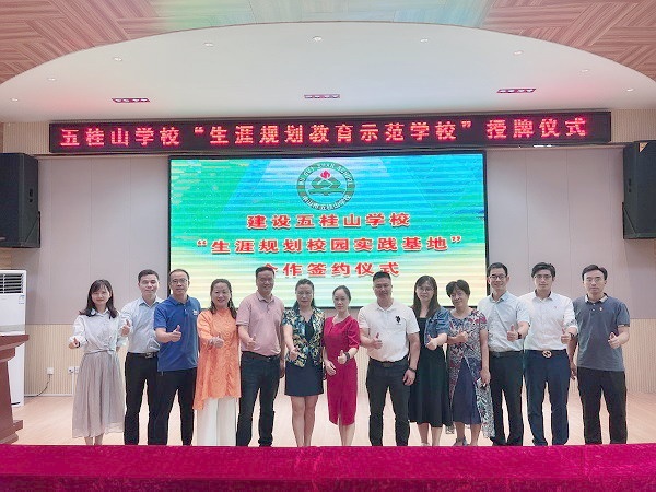 仪式上,李萌校长在讲话中表示,生涯规划教育对学生的成长以及未来发展具有十分重要的意义,可以让五桂山学校的学生从小学高年级阶段和初中阶段开始更早接受生涯规划教育,是一项功在当代,利在千秋,利于国家和个人的重要举措。李萌校长期待,通过与国际青少年生涯发展研究院的合作,五桂山学校的学生可以在科学的指导下更早地了解自我、发展自我、规划人生,更早确定未来的职业方向,让其当下学习更有动力,让其未来工作更有幸福感和意义。接着,蓝青林副校长与研究院代表进行了“中学生涯规划教育示范学校”的授牌仪式。李萌校长代表学校,与国际青少年生涯发展研究院黄丽芳院长签订了把五桂山学校建设成“生涯规划校园实践基地”的合作文书。最后,所有与会嘉宾进行合影留念。