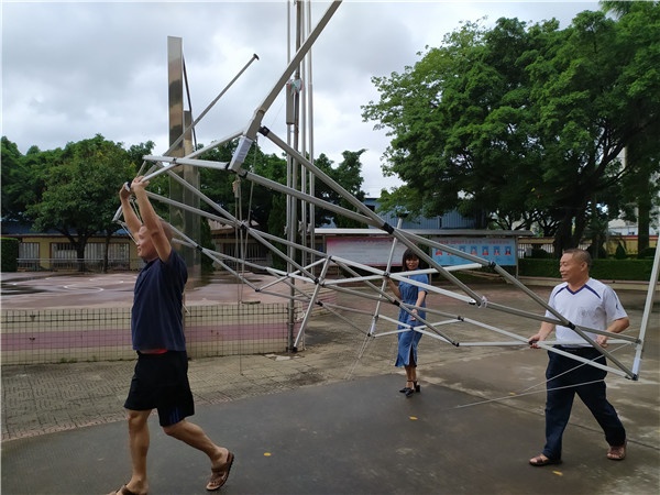 从清晨开始,刘万轩校长就带领全部行政人员举行防台风紧急预案分工会议,随后分工开始对学校外面陈列品进行紧急转移,对存在安全隐患的各类展示牌进行拆除,对学校的门窗、电器设备、大门进行加固。学校食堂采购人员备齐所有应急物资供,确保在校教师有充足的食品供应。全校严格执行“四停”有关要求,及时采取防风防雨应急响应措施,严格二十四小时值班巡视制度,把师生安全放在第一位,保证校园平安。