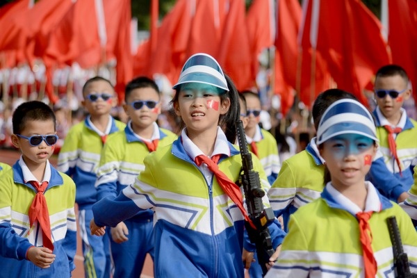 红旗拥簇处,同学们护着国旗,托起巨幅党旗、团旗和队旗,踏着整齐的步伐,呼喊着“请党放心,强国有我”的口号,意气风发地通过观礼台。宏大的场面,激烈的节奏,震撼着现场的每一位观众,观礼台上响起了阵阵雷鸣般的掌声。