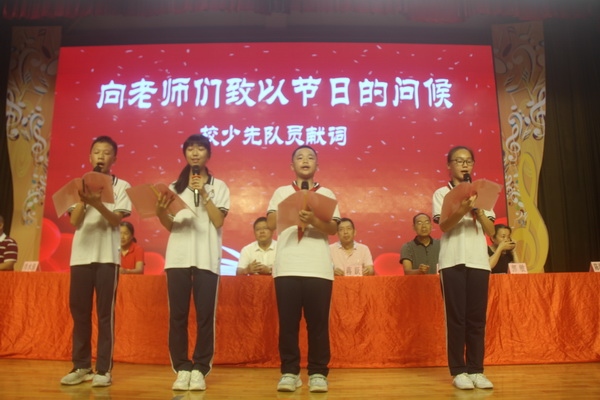 学生们为庆祝教师节准备了特殊的“礼物”。原彬豪、彭敏芝、欧梓瑶、肖学钞四位同学为大家带来的教师节少先队员献词《星空体育终将成为你们的骄傲》,用抒情的诗句,表达了同学们对老师的尊敬和赞美。