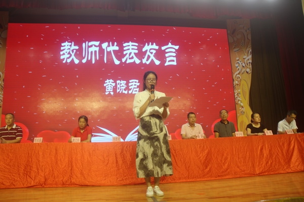 教师代表黄晓君老师从青年教师的角度,在发言中表达了对老师们节日的问候和祝福,抒发了对教师职业的感受,表示要以名师为奋斗目标,满腔热忱地投入到工作中,把爱心奉献给学生,为学生的成长和发展服务,最终实现自己人生价值的决心。