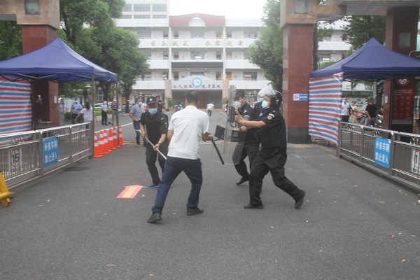 演练过程主要模拟一暴徒在校门口与安保人员发生矛盾,产生仇恨心理,遂转身拿出凶器,追打保安人员,强行闯入校园。门卫发现恐怖分子袭击后,立即进行阻止并发出警报信号。护校队员迅速出动,他们以3人为作战单位,正面一人使用盾牌,抵御袭击,掩护侧面队员反击。侧面队员使用钢叉叉脚,棍棒协防的战术,对其进行拦截,制止并控制其恐怖行为。其他人员负责保护和组织师生远离并躲避。由于门卫及护校队员反应及时,齐心协力,与恐怖分子展开勇敢搏斗,最终恐怖分子被制服,防止了损害行为的进一步发生。其他师生沉着应对,疏散有序。