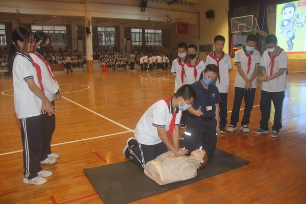随后的防溺水教育,红十字会的救护队员们利用人体模型,为同学们现场示范如何使用心肺复苏术进行急救,并让各班派五名学生代表上手进行练习培训,救护队员则在一旁边讲解基本操作边纠正同学的动作,让他们通过练习,体验和掌握心肺复苏术的每一个步骤。培训课堂气氛活跃,同学们踊跃参与急救技能演练。