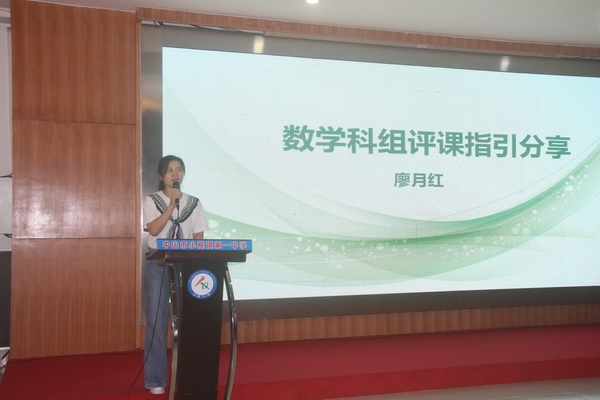 数学科组廖月红老师围绕“数学科组评课指引分享”这一中心,对如何开展评课活动做了分享交流。她认为评课应构建一个框架,教的方面,可对老师的教学设计、教学过程、教师素养等进行评议;学的方面,可对学生的学习习惯及状态、学习效果等进行评议。她还对这两方面的评课内容作了具体的分析。