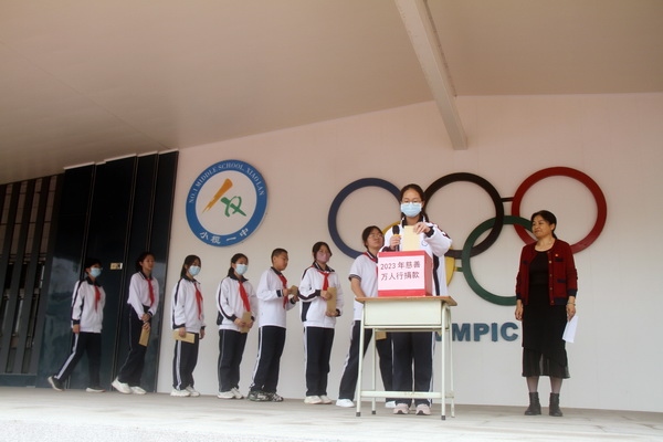 在捐款仪式上,各年级的级长代表年级老师、各班的班长代表班级依次走上主席台,报告各自的捐款数额,并将善款投入捐款箱。