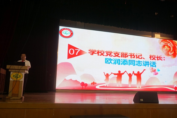 颁奖完毕,学校党支部书记欧润添校长致辞。欧校长的致辞激情有力,他向每一位教职员工致以节日的问候,回顾了上一学年学校各方面取得的辉煌成绩,同时鼓励全体教师不负责任与使命,力争做立德树人标兵,勇于承担教育重任。为更好地在学校营造浓郁的尊师重教良好氛围,他向同学们提出殷切要求。