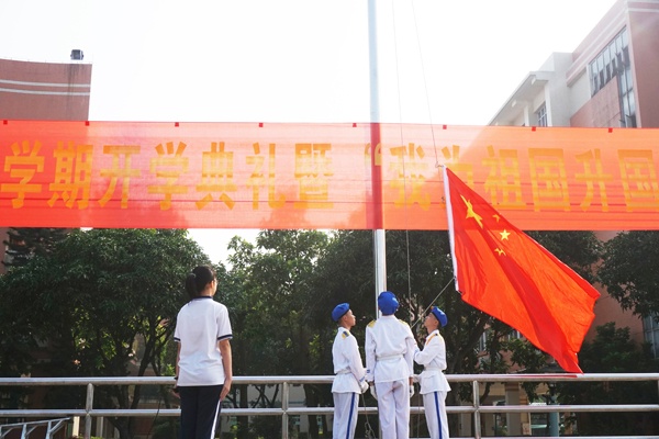 伴随着庄严肃穆的升国旗仪式,开学典礼正式开始,鲜艳的五星红旗迎着旭日,伴着晨风飘扬。