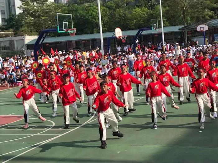 在全场1600多人奏唱国歌后,周丹青副校长为开幕式致词,她希望通过运动会激发全体师生团结进取、顽强拼搏的意志,在比赛过程中把安全放在第一,做文明运动员、文明小观众。运动员代表和裁判员代表黄楚权也分别进行了庄严地宣誓。石丽君副校长宣布开幕式正式开始。最后运动会裁判长梁钊健老师宣布比赛项目的议程。