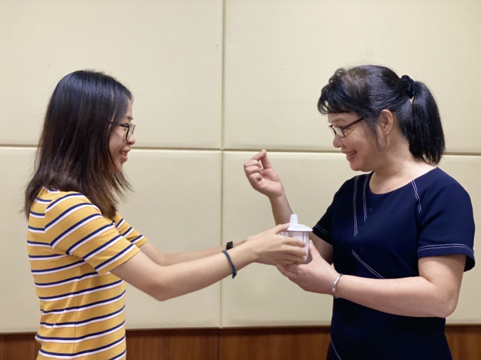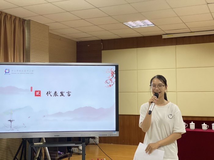 教学徒弟黄彩珊代表新教师进行发言。黄彩珊老师首先谈了她的感受,表示很感谢有师徒结对这个平台,让初出茅庐的新教师有了一个引路人,无论是在学习上还是在生活上。同时她还说了作为一个新教师虽然有活力、有激情,但是缺少经验,需要虚心向各位老师请教学习。