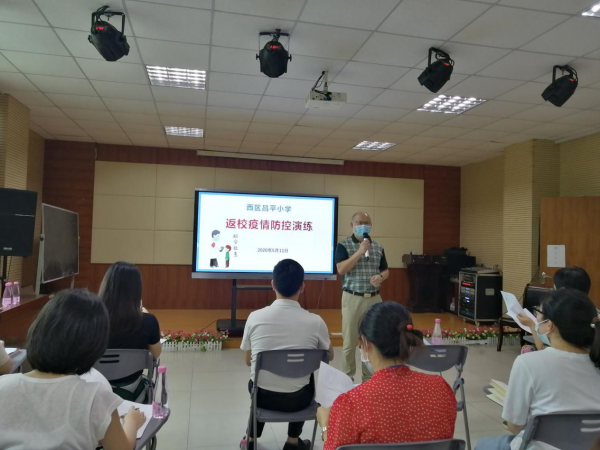 演练即实战,临危方不乱。为切实维护师生生命安全和身体健康,严防校园聚集性疫情的发生,确保学生正式返校开学后良好的教育教学秩序,2020年5月11日下午,西区昌平小学组织开展了四五六年级开学返校防疫模拟演练。区卫健局郭颖、区文体教育局何卫珊、驻校医生朱医生对本次演练进行全程督导和检查。