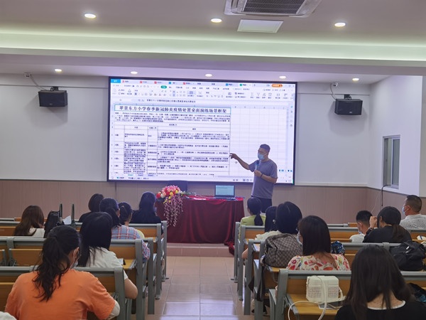 为进一步做好新冠肺炎疫情防控工作,落实学校疫情防控应急演练方案,保障全校师生身体健康和生命安全,2022年5月16日下午,翠景东方小学在报告厅开展新冠肺炎疫情防控应急处置桌面推演,该校的安全处主任林仲意就近期聚集性疫情,向全体教师讲解了一般情况和特殊情况下疫情防控应急处置的处理方法。
