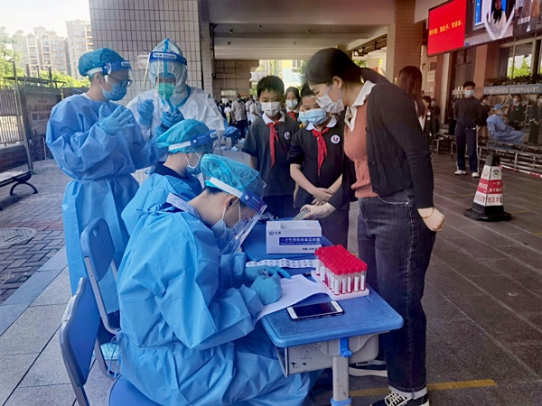 2022年4月8日上午8:30,核酸采样准时开始。该校的志愿者教师迅速进入“热战”状态,全副武装,积极投身到志愿服务中。班主任们准备好打印的学生名单、葵花码,听从广播指引,组织学生排队,在风雨操场进行检测。学生全程佩戴口罩,有序排队,保持一米间距,等候班主任点名,扫葵花码,采取“即采即走”的方式,不扎推,不逗留。核酸检测结束后,各班主任组织好学生返回班级。整个现场秩序有条不紊,检测工作一直持续到上午11:30。