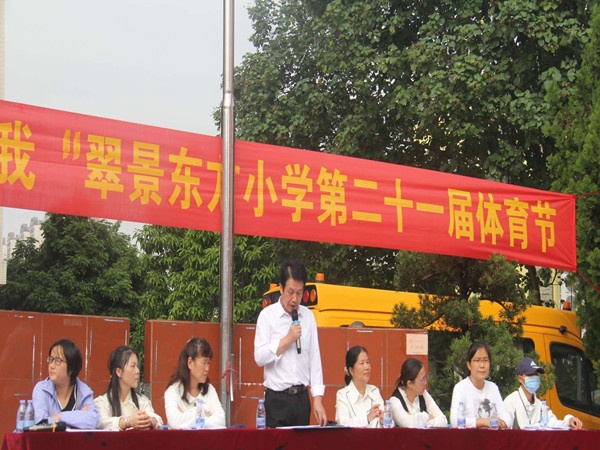 首先,翠景东方小学校长雷万兵致开幕词,他向为本届运动会各岗位辛勤付出的老师们表示衷心的感谢!他提出:本次运动会是翠景东方小学一年一度的体育盛会,是学校与社会、学生与学生之间增加了解、增进友谊、加强团结、促进发展的体育盛会,也是一个让同学们大显身手的舞台,还是该校向社会各界展示特色办学的机会。