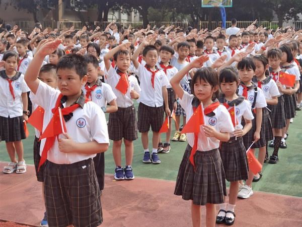 最后,全体少先队员向国旗敬礼,表达对祖国的支持和尊重,左手国旗,右手敬礼,少先队员们站得挺拔笔直。虽然天气炎热,后背早已湿透,可是大家对于祖国母亲的热爱,已然冲破了一切困难,这一刻,他们都为自己生在华夏而自豪!