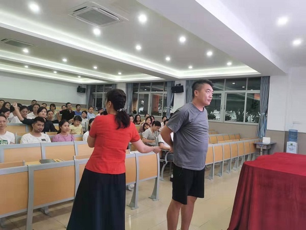 兄弟学校的课堂常规视频中那干净整洁的学习环境、师生规范的着装及言行深深震撼了大家的心,也激发了大家的斗志。因此,在该校常规的学习、演练时,大家非常配合:几十位老师一起学习、共同了解课前准备时老师的衣着、教室环境的布置、学生学具的摆放;一起演练老师候课、学生伏案静思、师生间的相互问好;共同规范课堂上老师的教态、教学语言以及学生的读书、答题的姿势等。