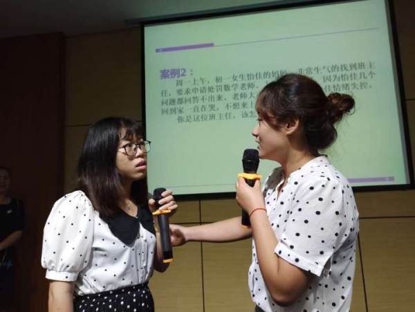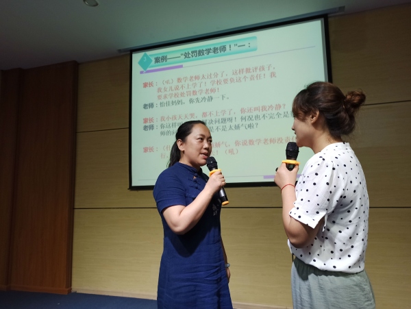 通过学生与老师、家长与老师的案例演练,老师们了解到沟通的技巧。理论与实践相结合的模拟场面让现场气氛推上高潮。老师们积极参与,与彭老师倾情互动,精彩表演沟通中的片段故事,现场笑声不断,其乐融融。于诙谐幽默中传授沟通的艺术,在轻松愉悦中提高自己的素养。 其中,在案例二“当家长与老师发生冲突时,班主任应该怎么做?”中,路海云校长将自己的亲身经历带进本次培训,让老师们明白,处理任何纠纷,学会倾听,坚持底线,积极沟通,更容易达成一致。