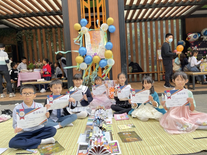 从阅读护照的动态作业到阅读活动的实境体验,本次校园书会由校长赠书、校园一角书会、班级书会三个部分组成。在校园一角和室内等多个场地同步开展各班独具特色的书会。户外场包括诗书廊、星空廊、雅趣阁、阅读馆、风雨廊,分别由二年级4班、三年级1班、四年级8班、五年级3班以及六年级8班等负责。室内场在各班教室进行。活动现场,学生以小组为单位,布置阅读场地,制作宣传海报,撰写广告词,准备推荐书籍,从下午2:30到4:00各项阅读体验活动纷纷开展,校园沉浸在阅读与分享、朗读与微表演、讨论与思考中,书香亦是成长之馨香,铁小时光里动人的一刻永远留在每一个孩子心中。