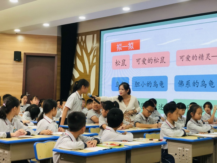 同课异构。该校冯子华老师作为有一定工作经验的教师代表与市教师发展中心安排的新教师吴旭渠共同执教五年级上册习作单元《松鼠》,以同课异构的方式从不同角度解读习作单元的教材解读与教学策略。基于对课堂教学的不同思考,两位老师呈现的课堂精彩各异。冯子华老师注重的是课堂的多维建构,从说明方法的学习到说明文体的教学,以句子作为突破口解决段落学习,直至构段能力的训练,落于文本结构思维导图的训练,使说明性文本学习与说明文习作的有机整合呈现有效的教学策略,给新教师树了教材解读与课堂呈现的精彩范例。