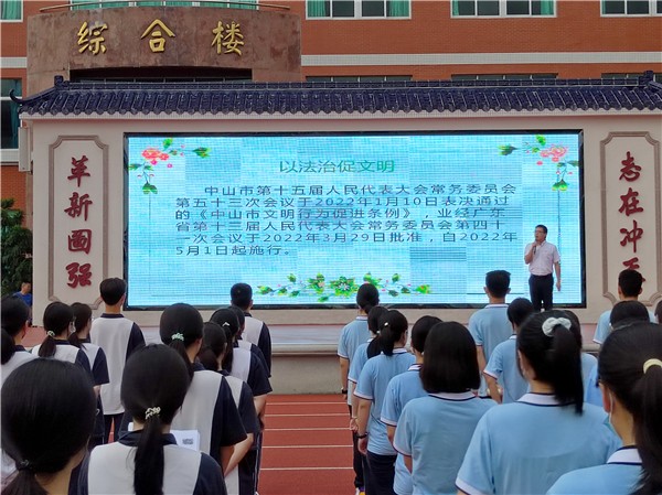 刘莉祥副校长首先对《中山市文明行为促进条例》进行了详细解读,并结合学校实际,对学生在校文明行为进行了表扬,并图文并茂的指出存在的不足,号召仙中学子以学习《条例》为契机,提高文明素养,做文明事,讲文明话,争做文明学子,共创文明校园,永续文明中山。