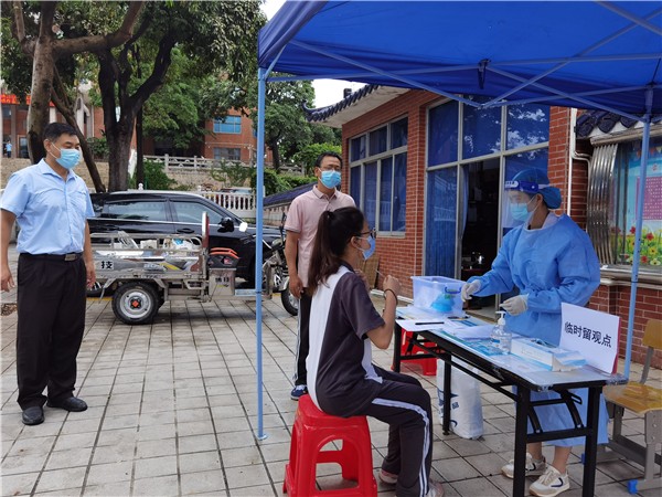 校外考生进入我校考点过程中测温发现该生体温超过 37.3℃ , 学校启动应急响应,按要求进行处置,同时上报。当复检结果显示学生体温仍然过高时,学生被带至医务留观室,由评估组医生作出专业研判。工作人员做好考生情绪辅导,医务人员带领考生到备用隔离考场准备考试。考试结束后,应急人员陪同考生赴定点医院发热门诊进行排查。消杀组对隔离考生所在考室及考场外公共区域进行消毒,驻校防控组医生全程参与和指导。