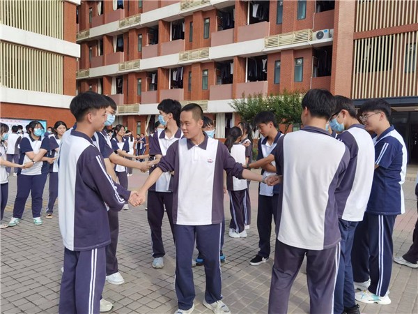 接下来,陈老师组织了两个团康游戏,一个叫“心有千千结”,另一个叫“众志成城”。在第一个活动中,学生们拉手围成圈,伴着音乐声随意走动,当音乐停止时,学生定在原地,左右手握住两侧的同学,在不松手的情况下,用跨、钻、套、转等各种方法,将交错的“手链”解成,然后围成一个大圆圈。这项游戏鼓励高三子在高考考场上沉住气、静下心,能解多少就解多少,能得几分就得几分。