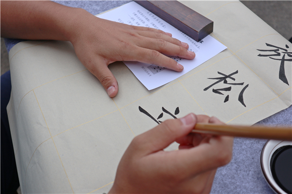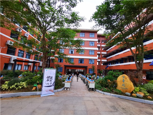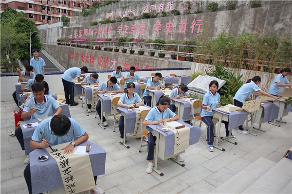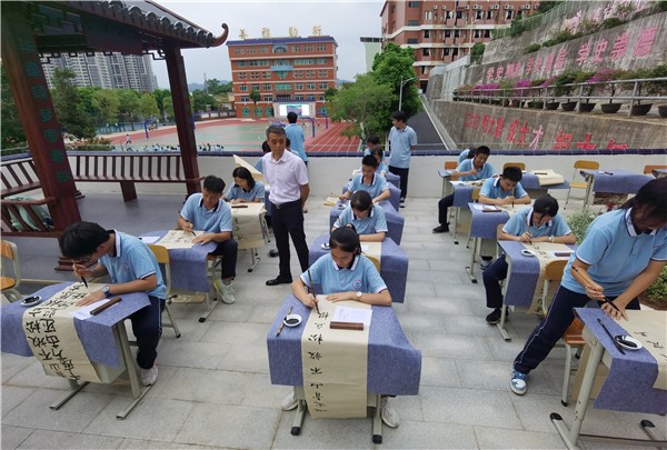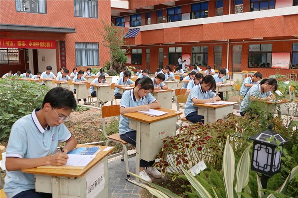 今年的书法比赛场地首次设在学校新增的两个景观点,毛笔书法是芳华亭,硬笔书法是百草园。草木掩映,流水淙淙,舒缓的音乐萦绕耳旁,书法比赛区一片宁静悠扬,参赛者们静心书写,人文书香浸润其中。