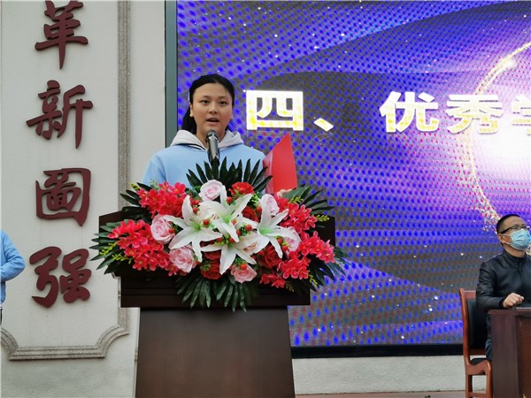优秀学子代表张霜霜发表获奖感言,感谢了江国良先生对优秀学子的褒奖。大家将带着感恩之情,怀着对未来的美好期许,脚踏实地,奔向远方,回馈母校、回报社会。她讲到,善、雅、勤、新的校训,将军志在冲天的精神,时时激励着同学们,以新仙中人之态鸣仙中之进步,以铿锵之势发仙中之声,为仙中发展添砖加瓦,努力成为仙中未来的荣光。