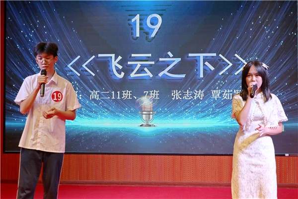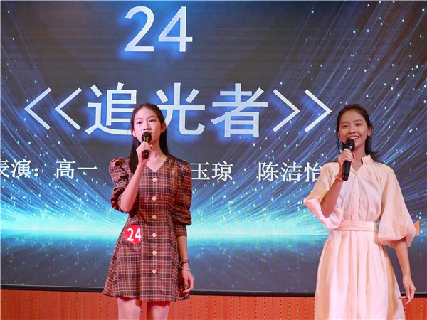 在这灯光与微笑构成的舞台,同学们歌唱美好的青春,在这笑声与歌声汇成的海洋,同学们飞扬嘹亮的歌喉。