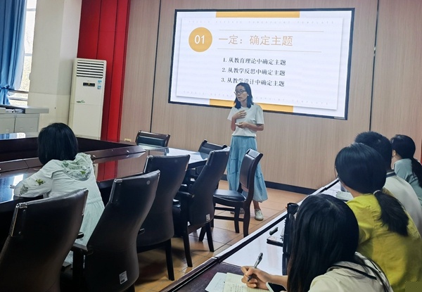 陈姗姗老师讲到,要上好课,坚持写教学反思,充分利用教学反思。教学在论文写作中占据80%的重要性,因此,老师们要重视教学反思的写作,通过教学反思写透一个问题,从教学反思中提炼出论文。结合自己多篇已发表的教学论文,陈姗姗老师详细讲授了如何通过“一分二定三整合”制定论文框架,包括:确定论文主题,切分观点的原则和策略,整合主题、观点和素材的方法。